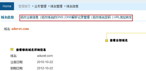 一、在管理中心管理域名(1) 1.在管理中心菜单选择 业务管理>域名管理 2.在域名列表中,选择需要管理的域名。 3.进入域名详细信息页面,可以看到有域名管理的各项菜单,我们先来看如果解析域名这个常用功能。 4.点击“dns解析管理"按钮,即可进行对域名的解析管理操作。 5.解析记录管理包括“增加IP”、“增加别名”及“增加邮件”三项管理功能。点击“增加IP”等链接即可进入相关管理界面,进行解析记录管理。 *增加别名:即域名指向操作。 *增加邮件:即域名的邮件交换记录管理。 |